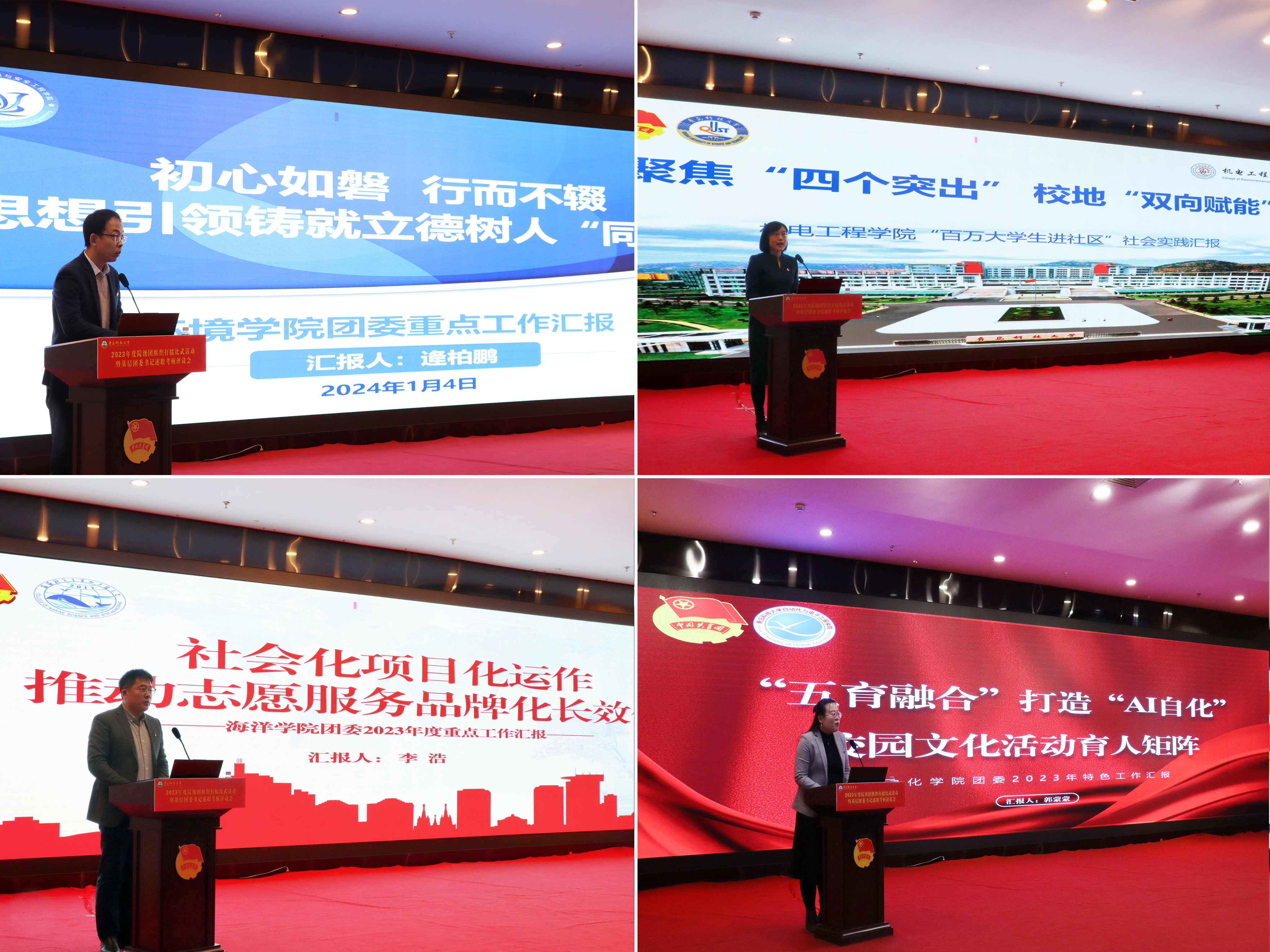 活动现场,22位院级团组织书记根据学校共青团2023年工作要点内容,围绕思想引领、社会实践、志愿服务、百万大学生进社区、校园文化活动、挑战杯竞赛、学生组织建设等共青团重点工作,进行工作述职和亮点特色项目展示。通过列数据、举实例等方式介绍各自特色、分享经验做法、谋划工作思路,充分展示了学校共青团系统在青年思想政治引领、全面从严治团、全面深化改革、服务青年成长成才、服务学校发展大局方面的工作成效,生动呈现了一场有温度、有深度、有成效的共青团工作“盛宴”。