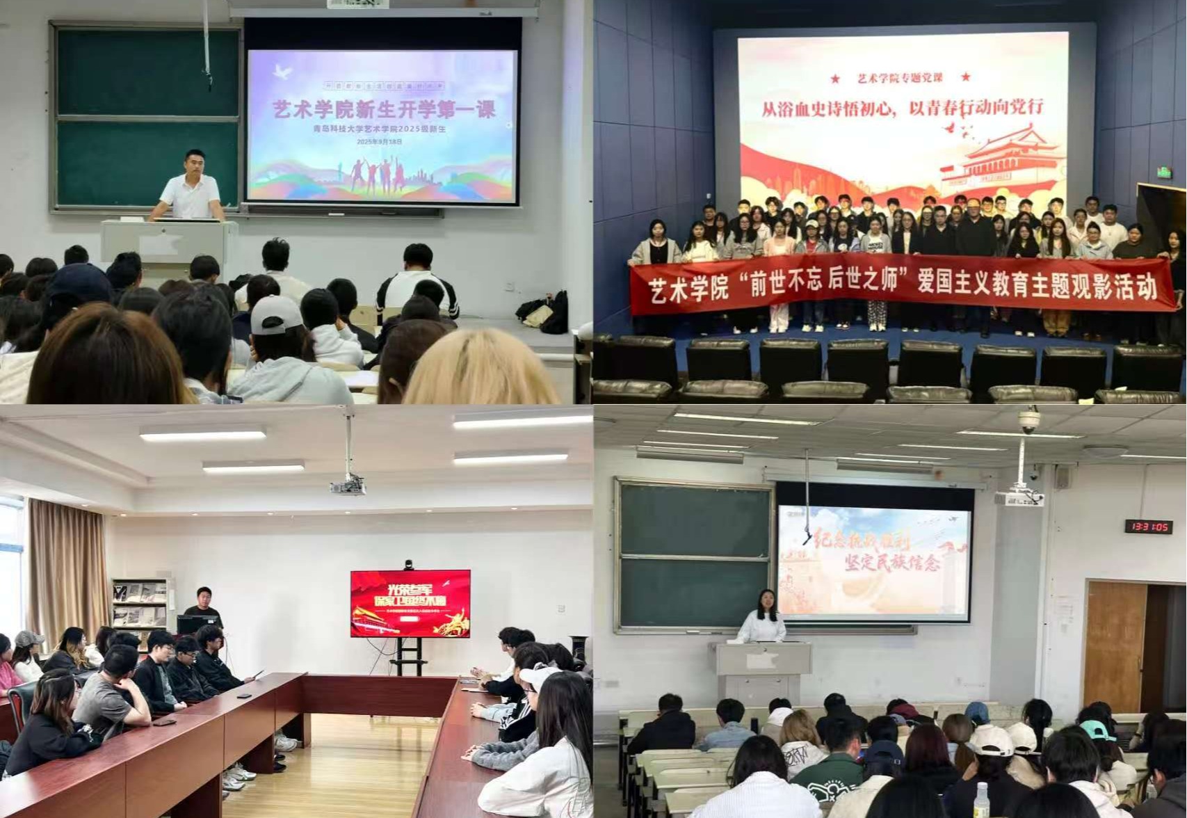 开学季,师生在青岛市大中小学开学第一课活动中参演《黄河大合唱》,打造沉浸式爱国教育课堂;纪念抗战胜利80周年之际,组织观看九三阅兵直播,开展思政教育;新生入学教育期间,举办国防教育暨征兵入伍经验分享会;国庆节期间,通过与国旗合影、题字作画等形式为祖国献礼;发展党员关键节点,为入党积极分子、发展对象打造沉浸式专题党课,组织观看红色电影。同时,各年级依托形势与政策课堂开展《纪念抗战胜利,坚定民族信念》专题授课,实现了爱国和国防教育全覆盖。