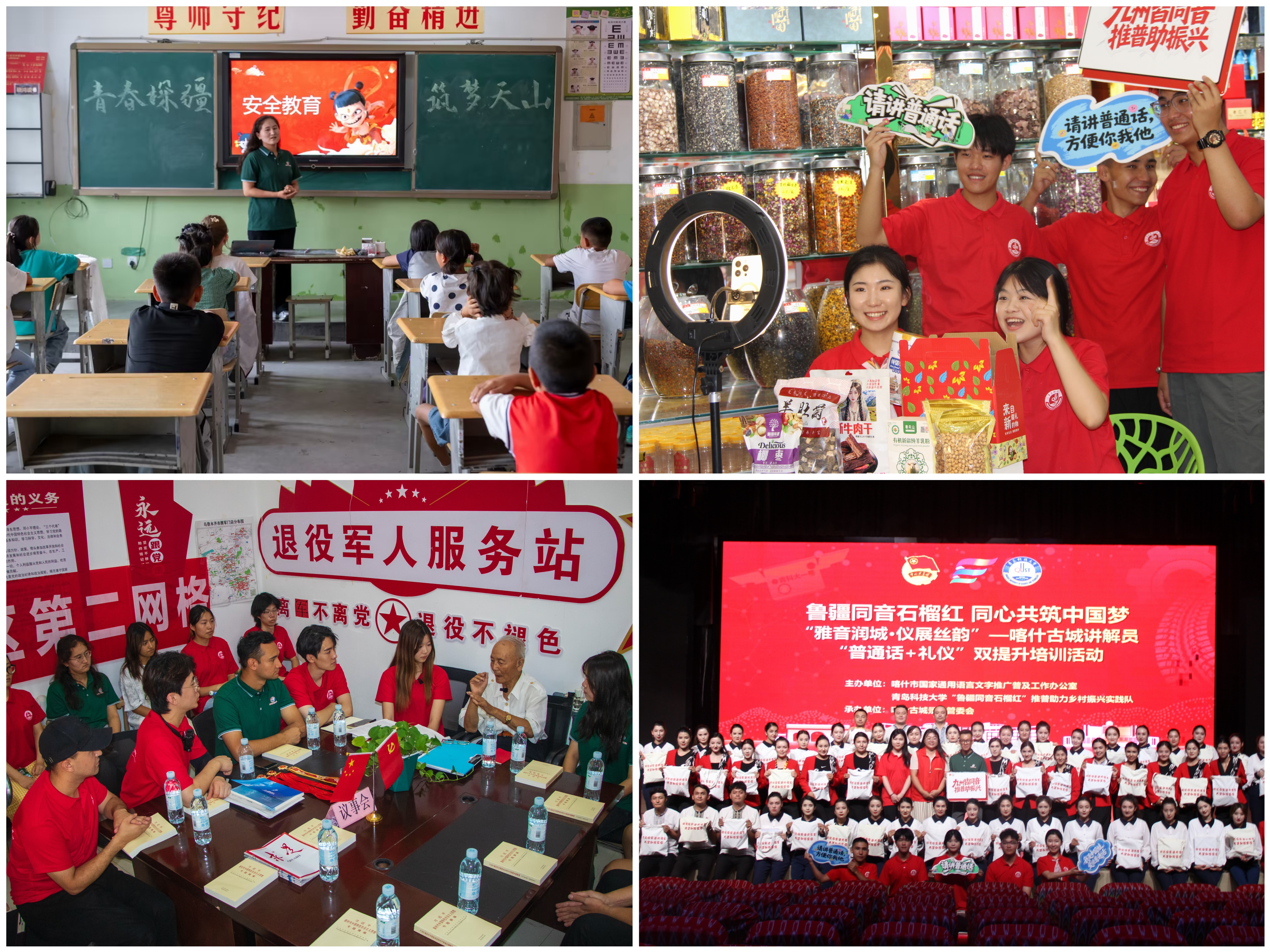 “鲁疆同音石榴红”推普助力乡村振兴实践团集结1名国家级普通话测试员、7名助教赴新疆喀什开展精准推普攻坚行动,团队聚焦文旅商户、双语讲解员、青少年三大核心群体精准赋能,打造“鲁喀带货直播间”、“鲁疆推普小课堂”等多个文化活动内容,开展推普电商主题相关直播13场,并对喀什古城、香妃园等文旅地标讲解员进行专项培训,推动推普工作与乡村经济繁荣、产业振兴、人才培育、文化传承同频共振。“青春探疆筑梦天山”社会实践队队员走访新疆机场历史陈列馆、八路军驻新疆办事处等红色教育基地,赴霍城县齐巴拉嘎西村小学开展“推普+”支教,创新设计普通话趣味课程与“心理+普法+环保”主题课堂,助力民族团结与乡村振兴。