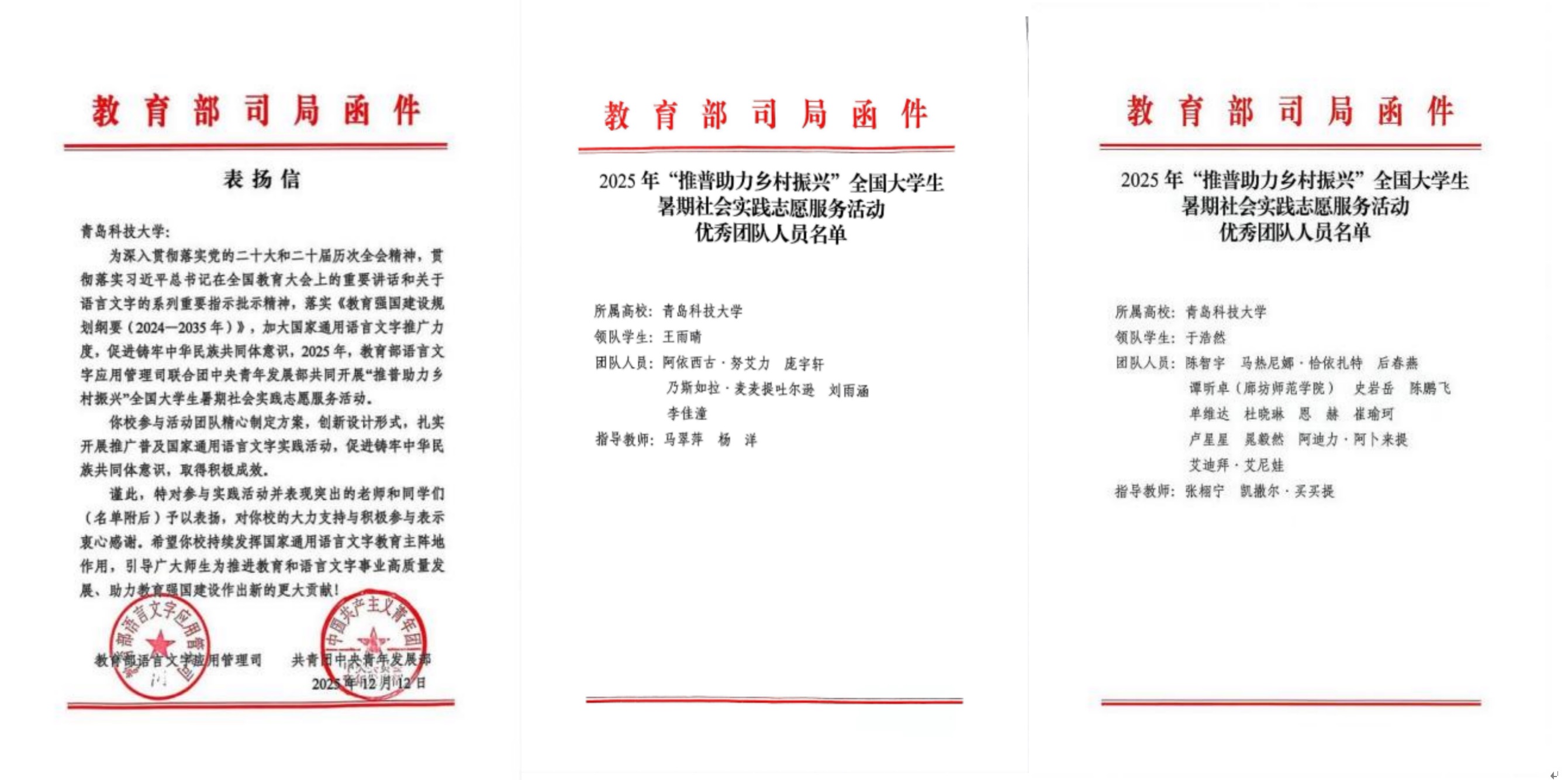 近日,学校收到来自教育部语言文字应用管理司与共青团中央青年发展部联合发来的表扬信,对学校教务处、团委指导的“鲁疆同音石榴红”推普助力乡村振兴实践团(指导教师:马翠萍、杨洋,负责人:王雨晴)和党委学生工作部、环境学院指导的“青春探疆筑梦天山”社会实践队(指导教师:张栩宁、凯撒尔·买买提,负责人:于浩然)2支“推普助力乡村振兴”实践团的突出表现给予高度评价。
