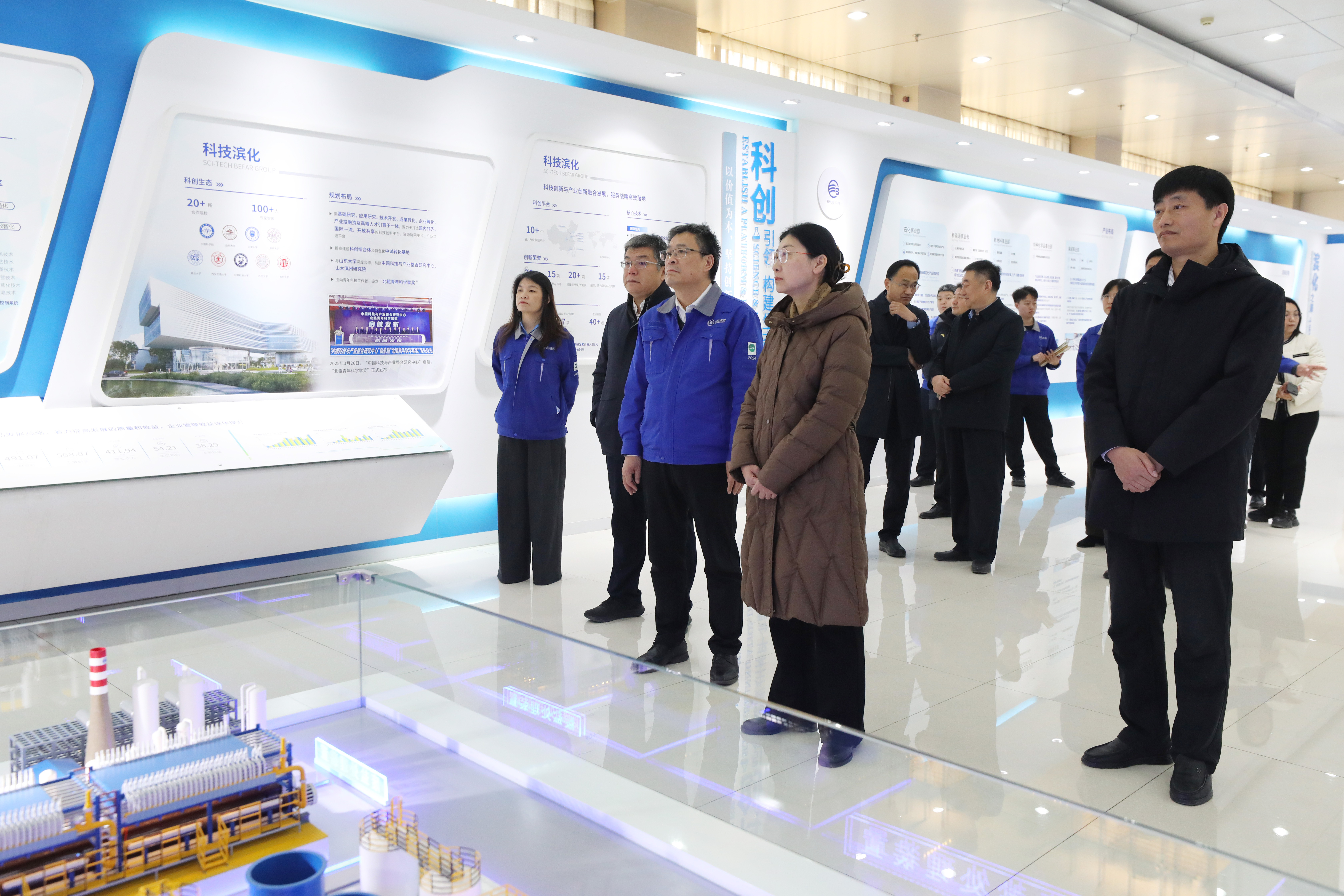 1月27日上午,王震一行在滨州市人社局党组书记、局长田洪刚,市公共就业和人才服务中心党总支书记、主任颜波,滨城区委常委、副区长张磊,滨化集团副董事长刘洪安的陪同下,到滨州和滨化集团调研走访交流。王震一行在滨化集团举行了座谈会,田洪刚致欢迎辞,详细介绍了滨州市产业布局、经济社会发展现状及人才引进政策。王震对滨州人社部门在毕业生岗位提供、人才政策支持、政校合作方面表示感谢,表示学校将以此次调研交流为纽带,进一步优化人才培养方案,强化实践教学环节,为滨州产业发展输送更多高素质应用型人才。刘洪安就滨化集团产业发展布局、人才招聘需求、学校在企毕业生工作情况进行了介绍。座谈会前,王震一行参观调研了滨化集团展厅,详细了解了滨化集团发展历程、核心技术、产业布局及未来规划,直观感受了企业的创新活力与发展潜力,为后续深化校企合作奠定了更坚实的基础。