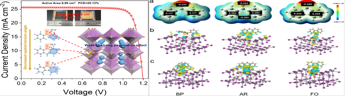 鉴于此,蒋晓庆副教授与洛桑联邦理工学院Michael Grätzel、中科院大连化物所郭鑫研究员等人合作,以太阳成集团tyc33455cc官网为第一通讯单位于Journal of the American Chemical Society刊发芳香酮的空间构象工程用于高效稳定的钙钛矿太阳能电池的研究成果[2]。研究表明,将芳香酮的空间扭转角从扭曲构型改变为平面构型,如二苯甲酮(BP,27.2°)、蒽酮(AR,15.3°)和9-芴酮(FO,0°)所示,导致显著增加了羰基周围的电子云密度,从而提高了铅基缺陷的钝化能力。因此,钙钛矿太阳能电池的性能也依赖于芳香酮的扭转角,基于FO的共面钙钛矿太阳能电池实现了25.13%的最高功率转换效率(PCE),并且在连续1个太阳光照明下的最大功率点(ISOS-L-1I)工作1000小时后仍保持其初始效率的92%。研究结果强调了分子构象对羰基钝化效果的影响,为芳香酮作为高效稳定钙钛矿太阳能电池钝化剂的设计和开发提供了更深入的见解。