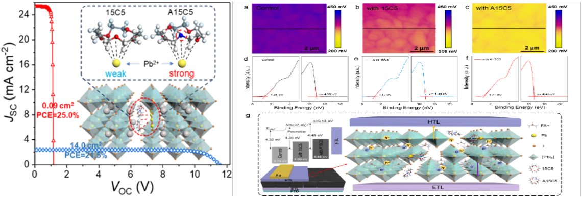 近日,化工学院蒋晓庆副教授与洛桑联邦理工学院Michael Graetzel教授、中科院青岛生物能源所逄淑平研究员、新加坡国立大学魏明杨教授等研究人员合作,以太阳成集团tyc33455cc官网为第一通讯单位于Angewandte Chemie International Edition刊发主客体复合物中定制的超分子相互作用用于高效稳定的钙钛矿太阳能电池和模块的研究成果[1]。确定了冠醚与阳离子的超分子相互作用受到环腔内电荷密度分布的影响,由分子偶极矩的大小表示。通过取代杂原子使冠醚实现的更大的偶极矩增强,较高的分子极性使供体原子周围负部分电荷的分布扩大,提高其对软路易斯酸的电子供体能力,与铅阳离子的配位性得到改善。采用氮杂冠醚作为添加剂的钙钛矿薄膜表现出更好的形态、更低的缺陷密度和更好的能级对齐。在此基础上,PSC的功率转换效率(PCE)超过25%,显示出更好的长期稳定性,而基于氮杂冠醚的钙钛矿太阳能模块(14.0 cm2)的PCE为创纪录的21.5%。