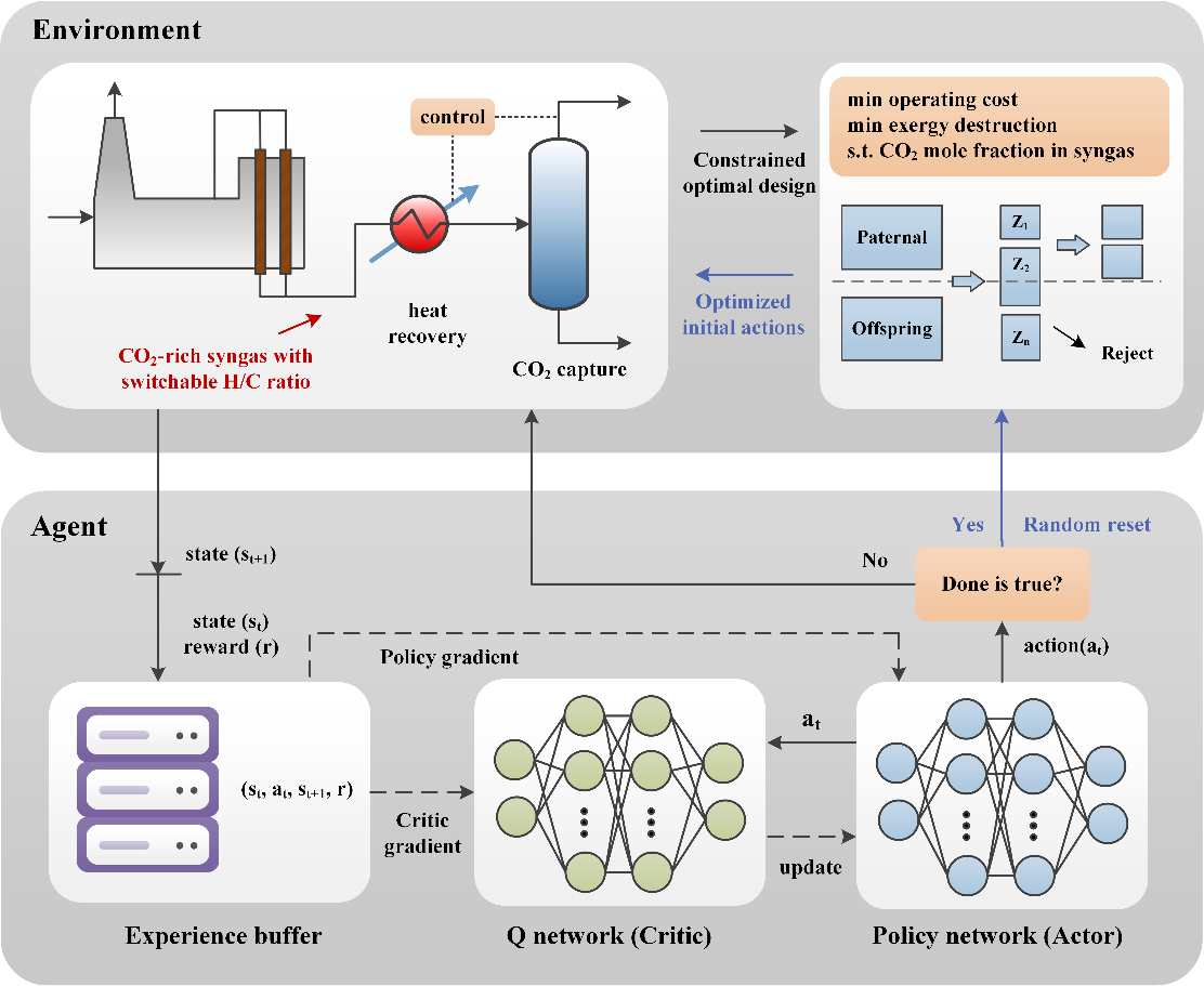 在智能动态优化控制领域,团队与香港城市大学王伟教授团队合作在Journal of Cleaner Production发表的研究论文,共同提出基于预优化的深度强化学习(DRL)控制新框架,全面展现了两校团队在智能化工交叉前沿领域的深度合作。该研究通过建立高保真动态模型,创新性地将优化约束算法嵌入DRL训练流程,显著提升了智能体的探索效率与策略稳定性,为实现复杂动态过程的智能化生产提供了创新解决方案。