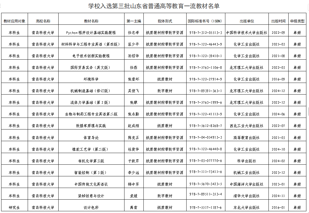 近日,《山东省教材委员会办公室关于公布第三批山东省普通高等教育一流教材名单的通知(鲁教材委办〔2025〕1号)》确定了第三批山东省普通高等教育一流教材,学校有16种教材入选,数量位居山东省属高校首位。