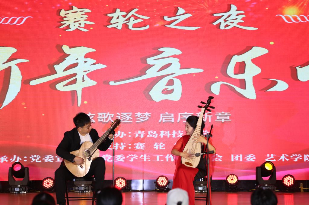 古典吉他齐奏《我和我的祖国》弦音细腻悠扬,将新时代青年对祖国的炽热爱恋娓娓道来。王一平与王右老师携手演绎的琵琶与古典吉他合奏《忆江南》,巧妙融合民乐的清越灵动与西洋乐器的温润醇厚,勾勒出如诗如画的江南意象。赵冬梅、韩露老师与钢琴专业学生带来的钢琴与电钢琴合奏《克罗地亚狂想曲》节奏明快激昂、旋律朝气蓬勃,充分展现科大学子锐意进取的青春姿态。多次登上央视《风华国乐》舞台并屡获大奖的阮咸室内乐团带来的《阮之火》,以创新演绎彰显多元文化交融的时代风采。